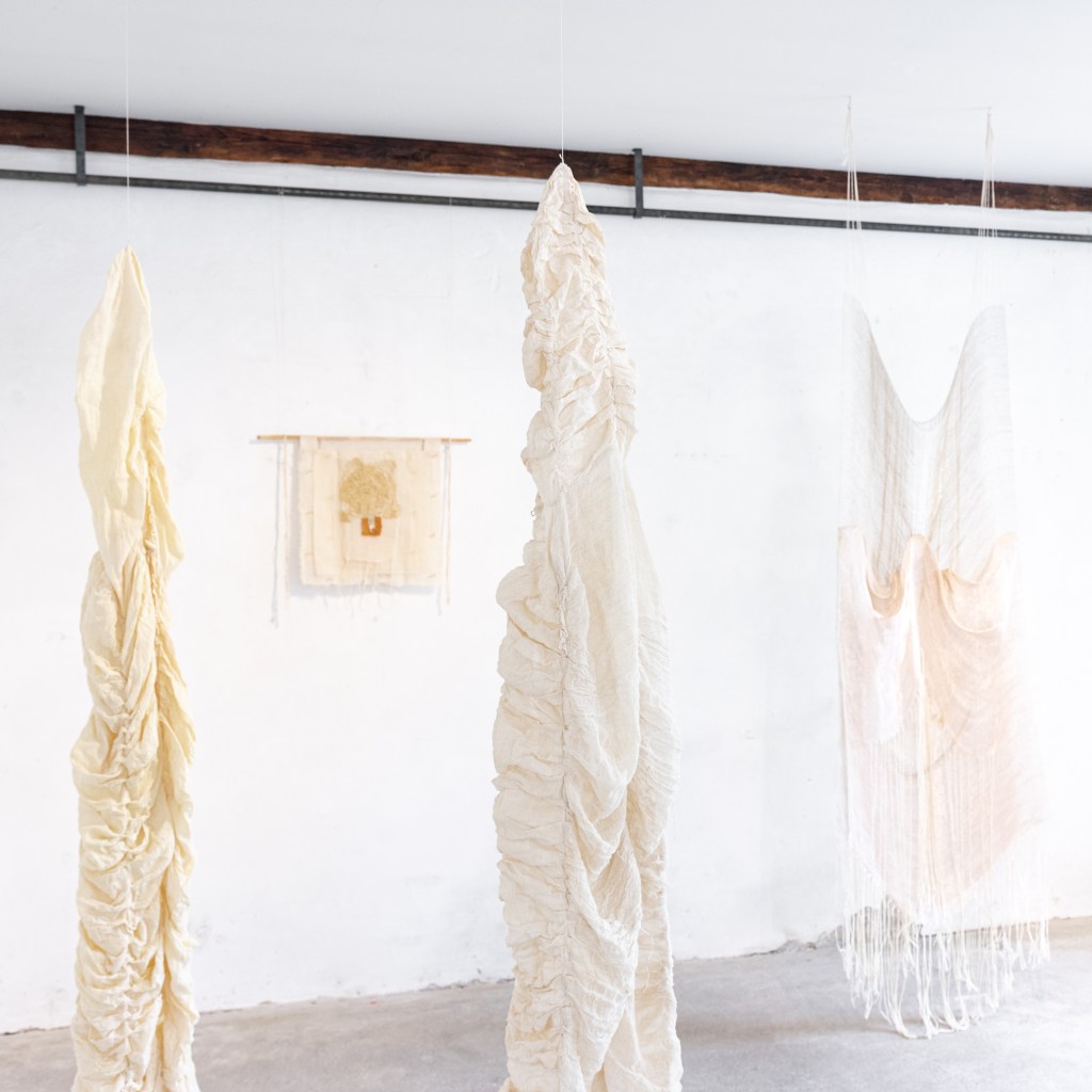 In Soothing as Shelter, the Morus Project’s teamwork and methodology are embodied in an installation featuring three handcrafted elements: a silk fabric, a publication, and a ceramic teapot with tea bags. The curved silk fabric, created collaboratively as artists passed it along and added to it, symbolizes the intertwined nature of their work and forms a cocoon-like space that offers visitors privacy and an opportunity for introspection. The tea is made from mulberry leaves, which are the silkworms’ primary food, while the accompanying publication that is embedded in the installation captures the project’s research, creative process, and curatorial approach. Additionally, there are QR codes placed at the mulberry trees of the Botanical Garden of the Jagiellonian University, forming a conceptual connection with the Bunkier Sztuki Gallery. Overall, the installation links Poland’s rich textile heritage with Greece’s long tradition of sericulture, inviting people to slow down, find shelter, and reconnect with nature through art.